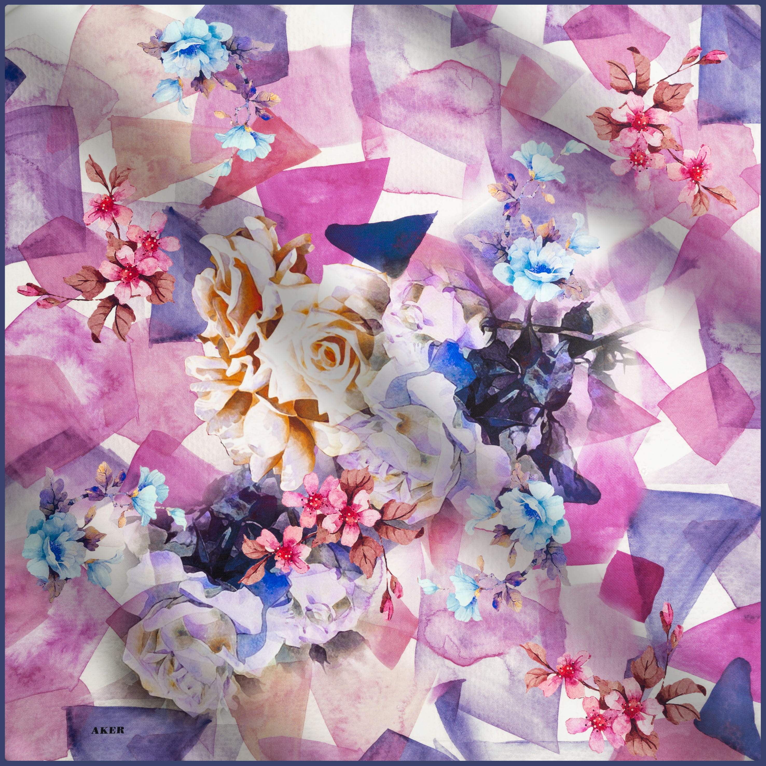Create a whimsical and feminine vibe with Aker Dreamscape silk scarf that features roses in a psychedelic art work. Designer silk scarf in this coveted fabric is highly sought after. Be unique and be bold.